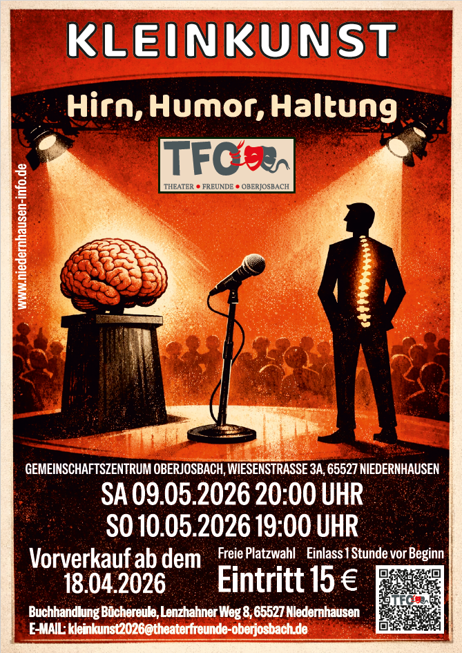 Der Vorverkauf beginnt am 18.04 in der Buchhandlung Büchereule und gerne auch per Mail: kleinkunst2026@theaterfreunde-oberjosbach.de.